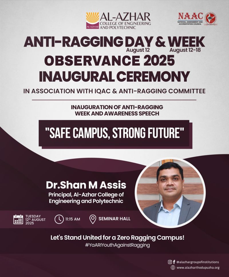 Highlights from the Anti-Ragging Day & Week Observance 2025 at Al- Azhar College of Engineering and Technology, themed “Safe Campus, Strong Future.” Let’s build a campus where respect thrives and fear has no place. Let’s spread awareness together!