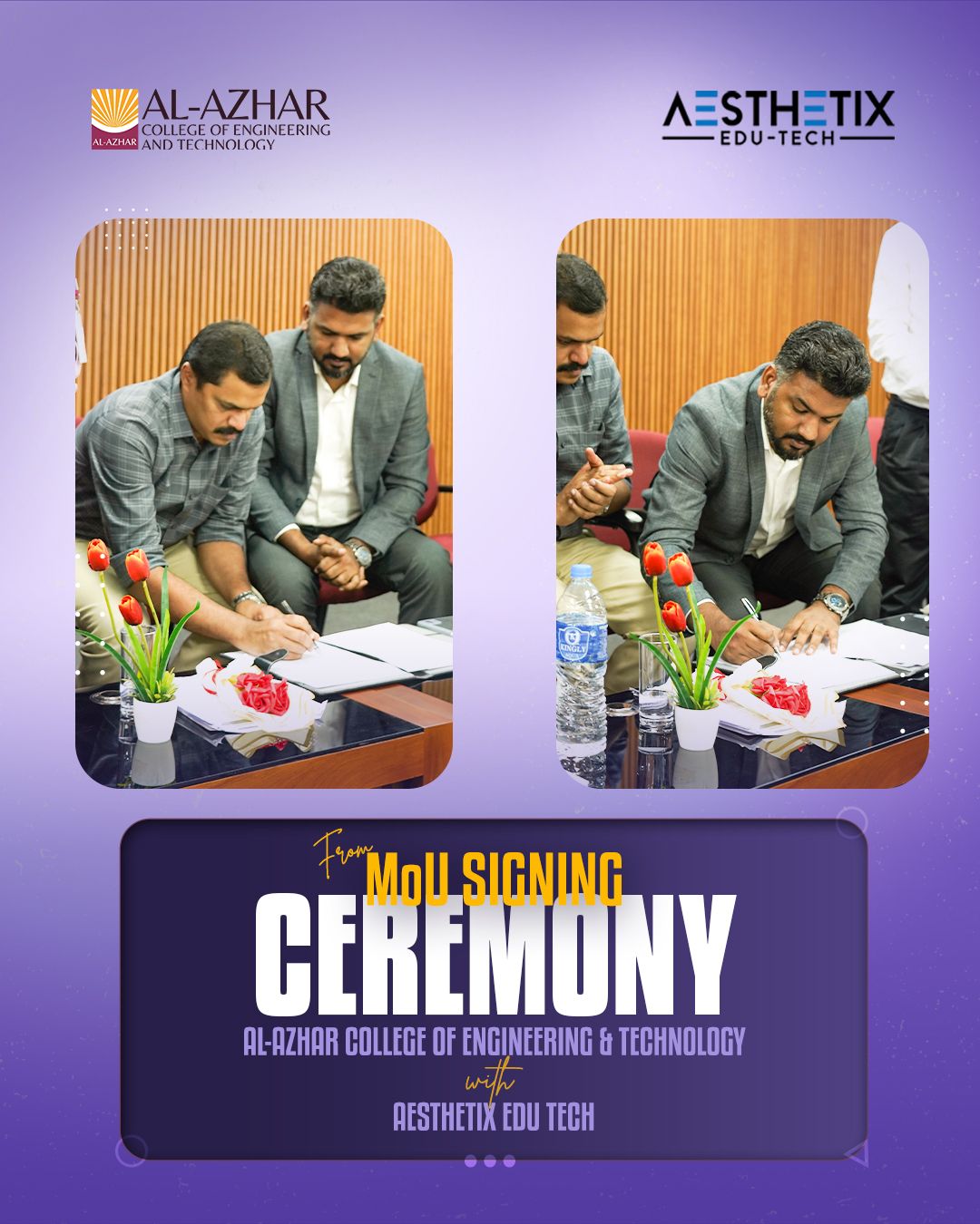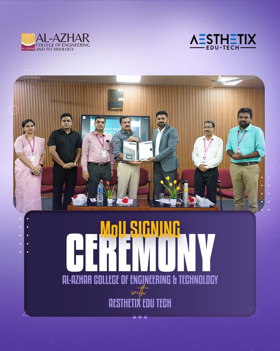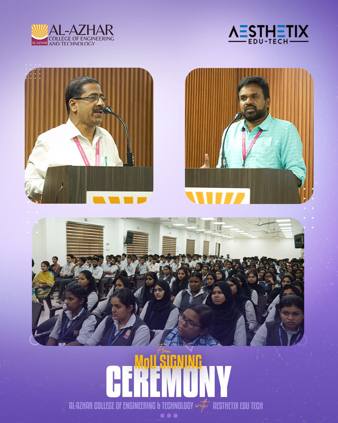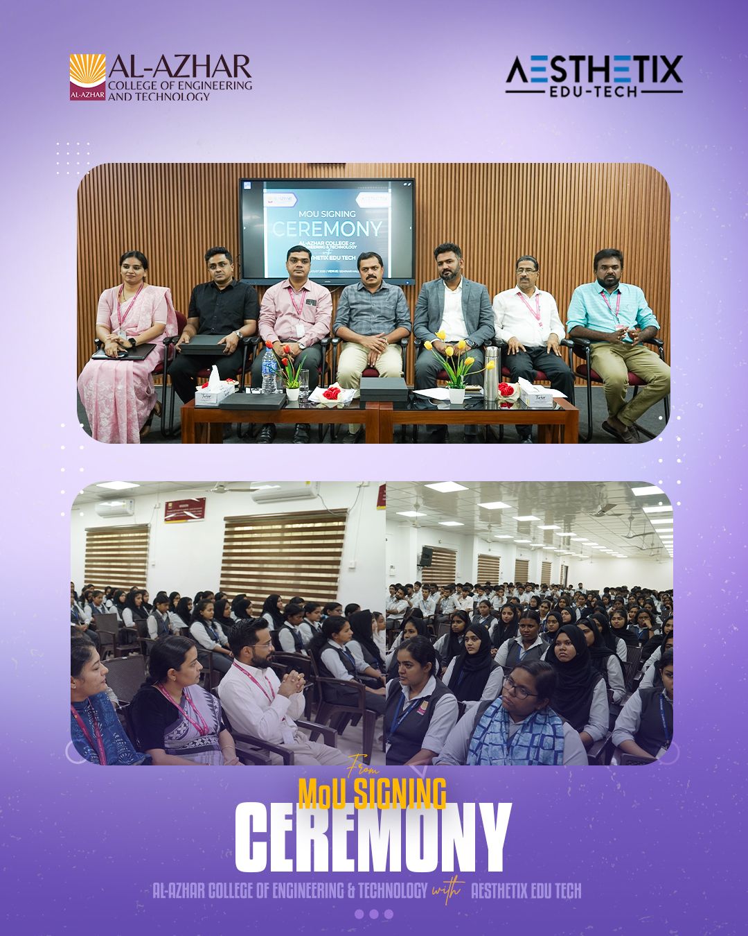 Glimpses from the MoU Signing Ceremony between Al-Azhar College of Engineering & Technology and Aesthetix Innovations LLP, held on 8th August 2025. The MoU was signed by Adv. Mijas K. M., Managing Director, and Mr. Akhil Shan, Director of Aesthetix Innovations LLP, in the presence of Dr. Paijas K. M., Director; Dr. Shan M Assis, Principal; Vice Principal; Academic Director; Placement Coordinator; faculty members; and students. This collaboration aims to deliver advanced, recruitment-oriented placement training to enhance students’ industry readiness and career prospects.