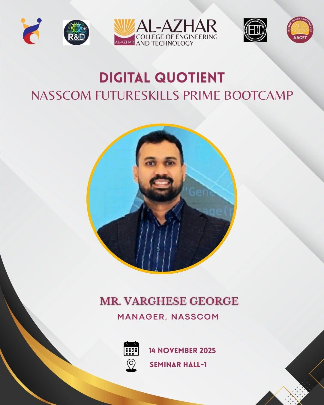 Proud to host the NASSCOM Futureskills Prime Digital Quotient Bootcamp at Al-Azhar College of Engineering & Technology. Mr. Varghese George, Manager, NASSCOM, led an engaging and hands-on learning session that empowered our students to strengthen their digital skill set and gain clearer insights into evolving industry expectations. A truly valuable and practical bootcamp experience for our learners — looking forward to more such meaningful collaborations.